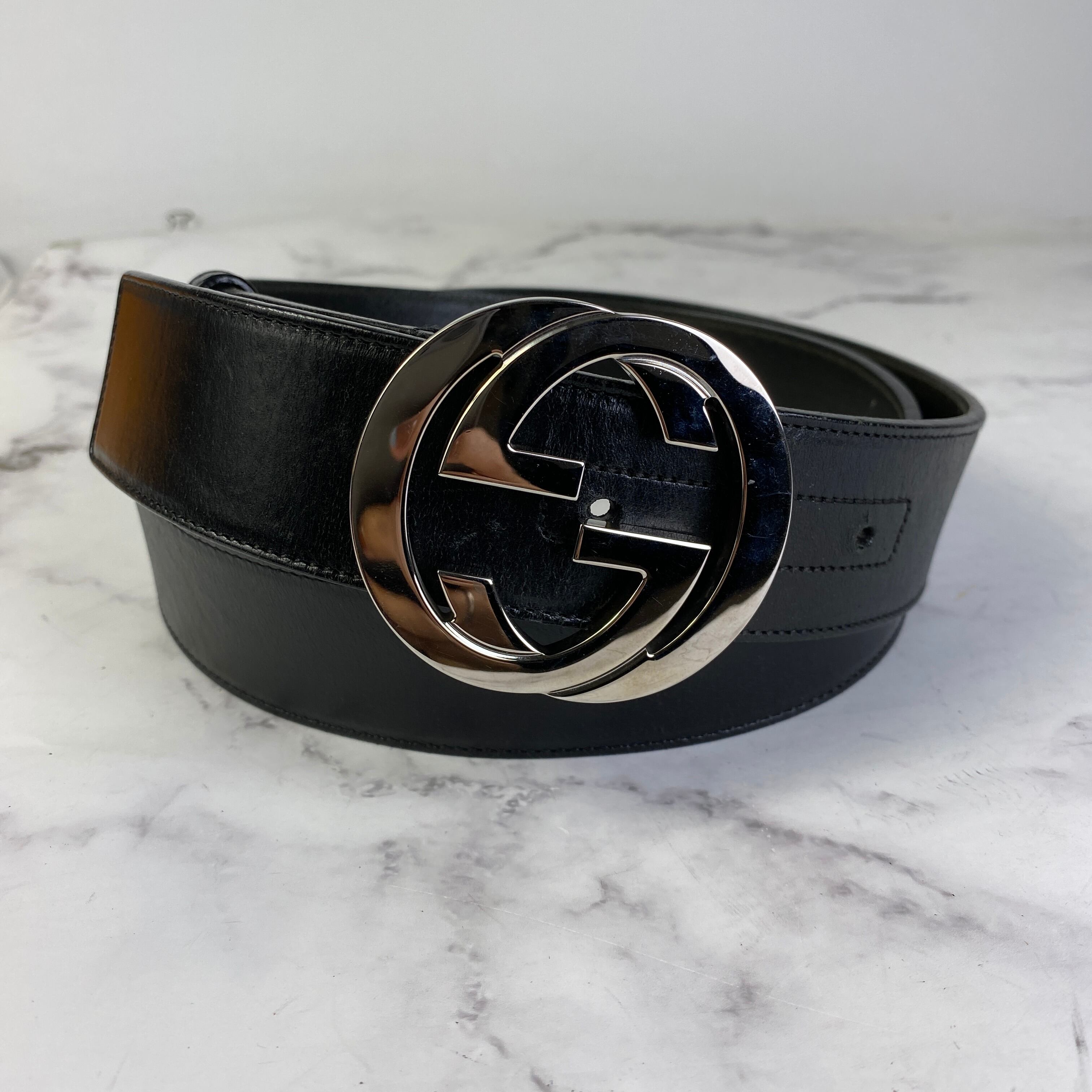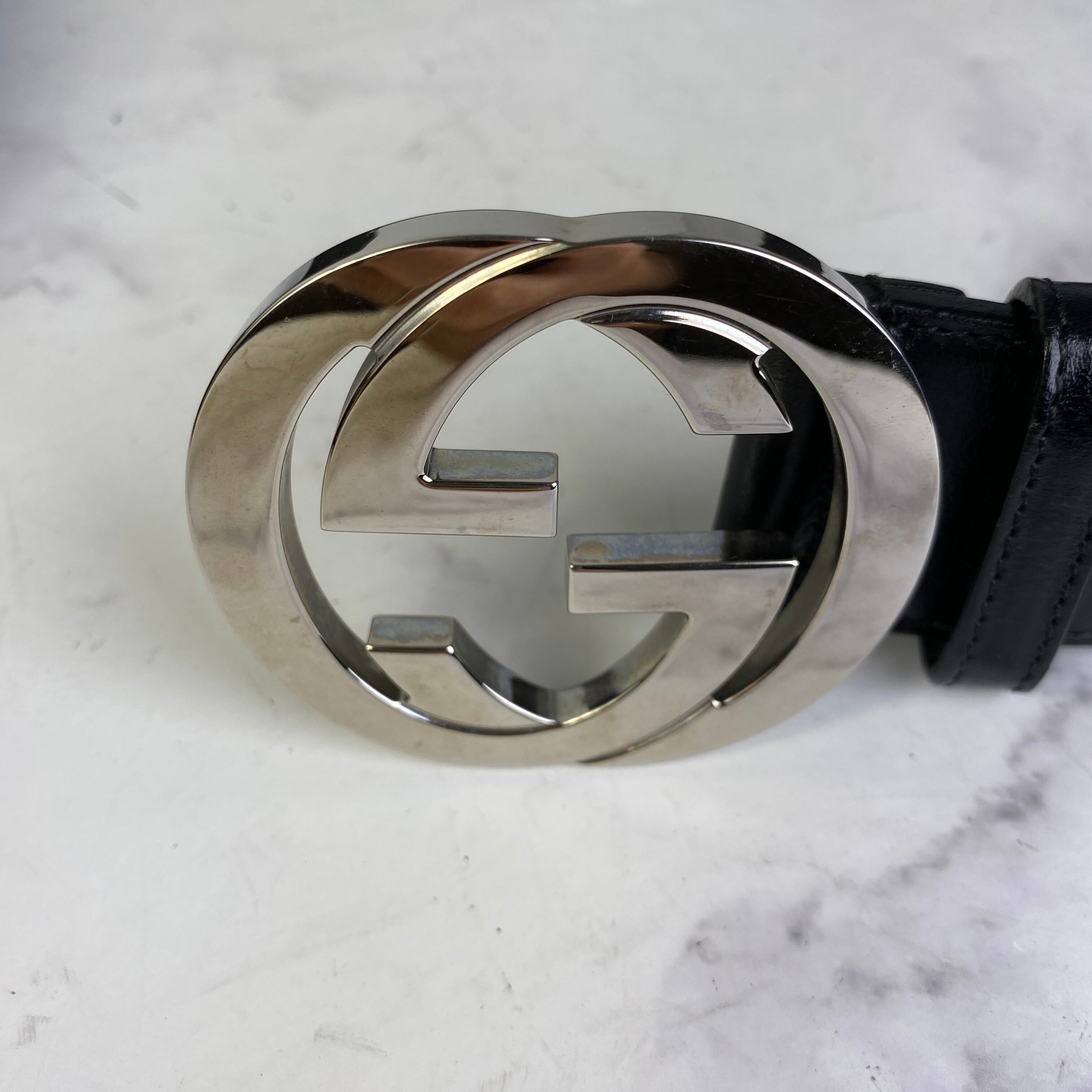 良品 GUCCI グッチ インターロッキングG レザー ベルト ブラック A-7206