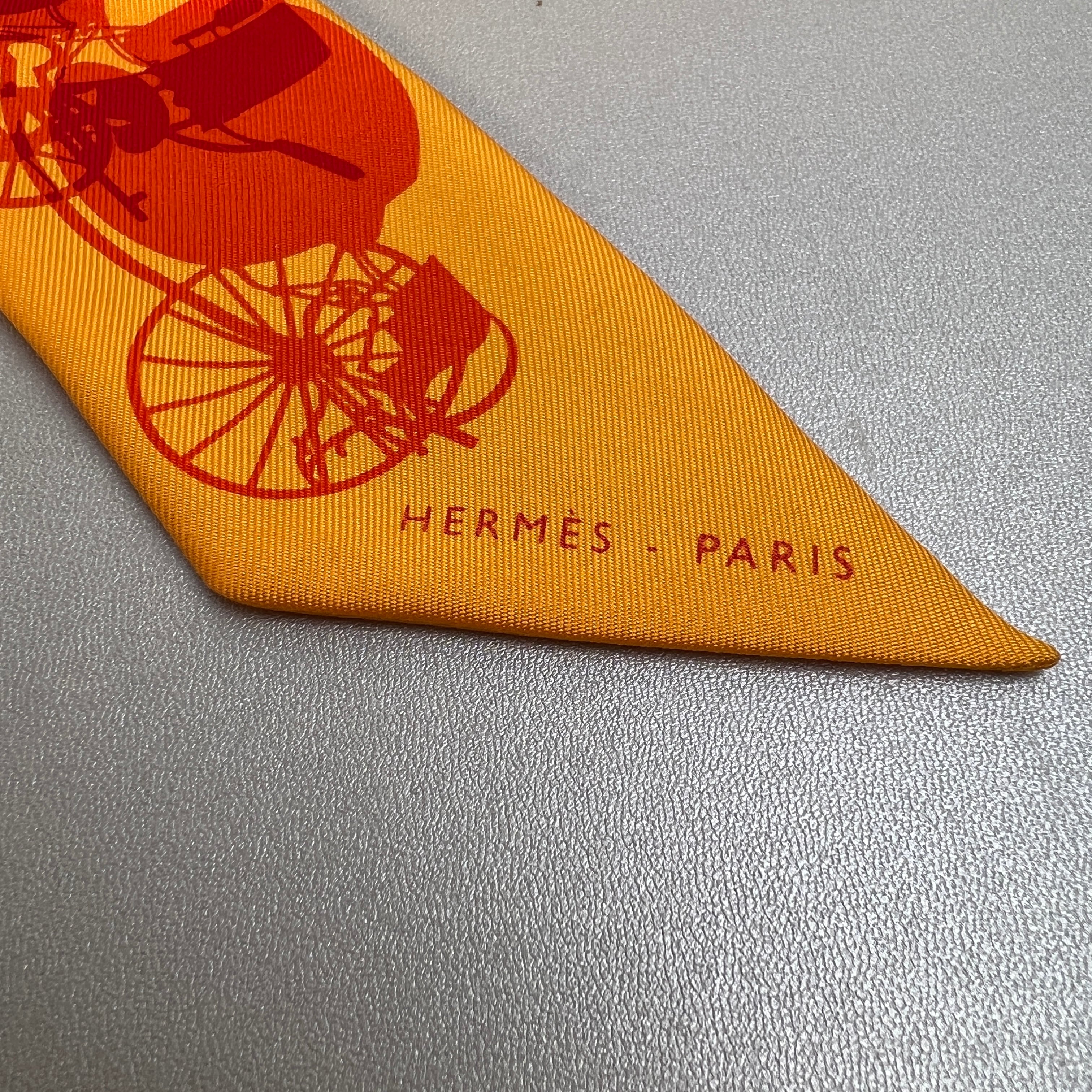 良品 HERMES エルメス タグ付き 馬車 シルク ツイリー オレンジ A-11506